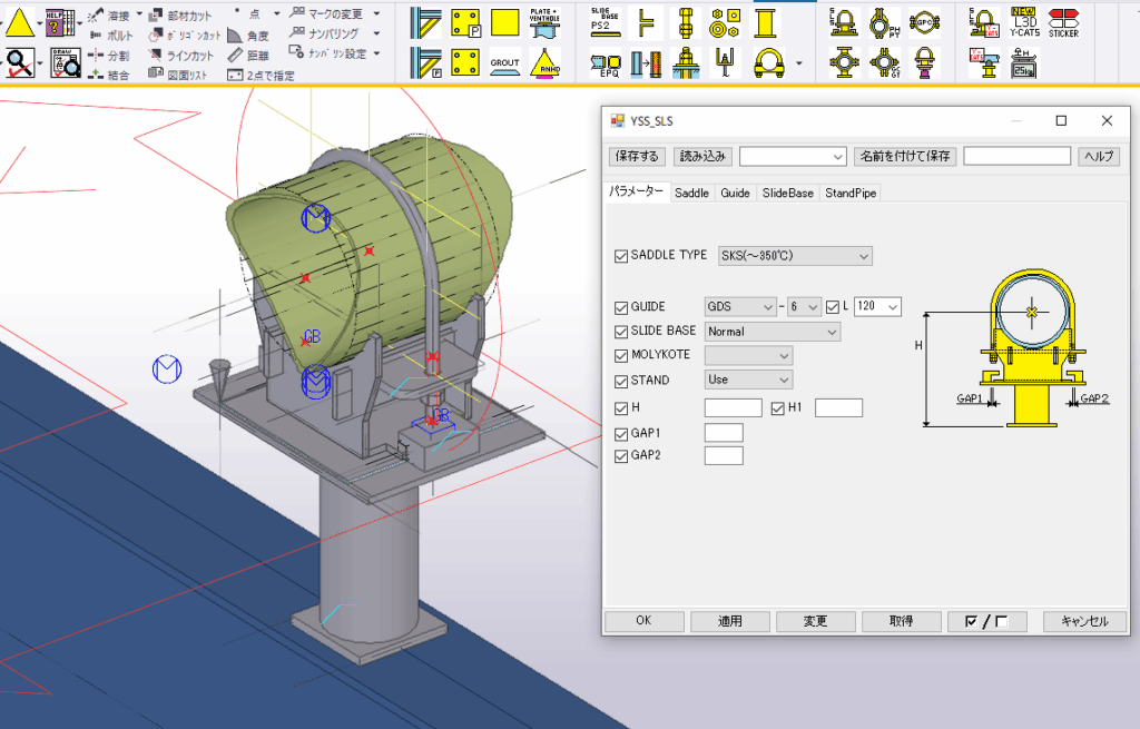 発電プラントの配管支持装置は、単に配管の重量を支えるだけでなく、熱膨張による配管の変化や、地震時などの揺れ対策も求められる。Teklaにはユーザーが独自に補助ツールなどを開発できるカスタマイズ機能があり、同社は配管支持装置設置や鋼材入力などの作業をより効率的に進めるための補助ツールを整えてきた。これまでに開発したシステム数は50を超える。例えばTeklaモデルから配管径や梁までの距離を自動把握し適切な配管サドルを抽出するほか、Teklaモデル上で配管支持位置の指定によって必要なオプションの選択ができるようにするなど、補助ツールが設計の品質確保に貢献し、作業の円滑化についても下支えしている。