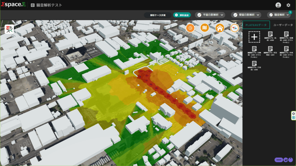 騒音解析では、工事などの発生音の広がりをシミュレーションし、その状況を3次元モデル上に見える化できる。発生音の種類を選択することで、利用目的に応じた分析も可能だ。音の広がりを3次元で把握することから、遮音壁などによって音がどの程度遮蔽されるかも把握できる。見落としがちなマンション高層階への影響など工事作業の音が何階まで聞こえるかも分析でき、工事現場における騒音対策のツールとしても有効という。