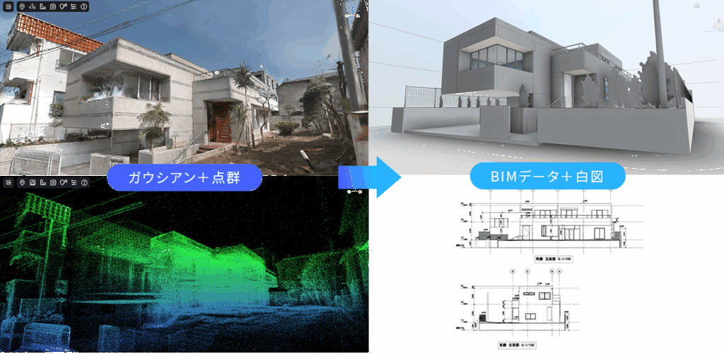 今回のプロジェクトでも詳細図面がなく、いかに効率的かつ正確に現況を把握するかが大きな課題だった。One-Stop BIM! Gaussは最先端のスキャン生成技術「3D Gaussian Splatting(ガウシアン・スプラッティング)」を搭載しており、最新のSLAM式ハンドヘルドスキャナでの計測により、建物外観だけでなく、庭の植栽や敷地の高低差まで含めた高精細な現況データを迅速に構築した。