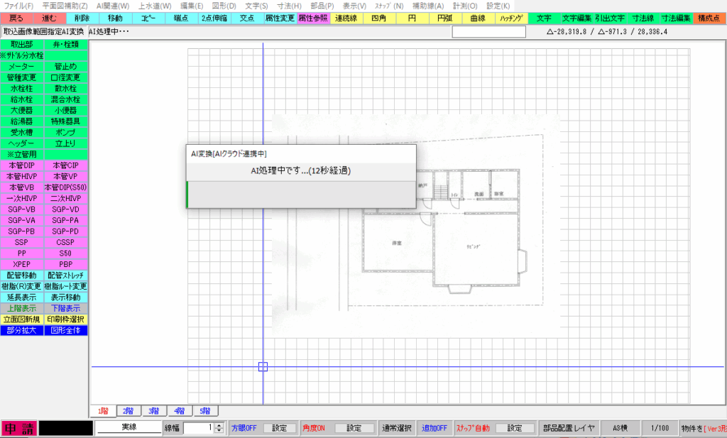 アップデート版では、画像データやPDF・DXF図面上の壁線、敷地の認識による単線化、器具の自動認識・配置を可能にし、従来30分程度かかっていた作業を数分で完了できるようになる。上下水道分野の建築図面はCADデータやPDFデータだけでなく、紙図面を提供されるケースもある。これまで給排水設備業者などのユーザーは、申請作業の中で図面の洗い出しに時間をかけていた場面も多かった。