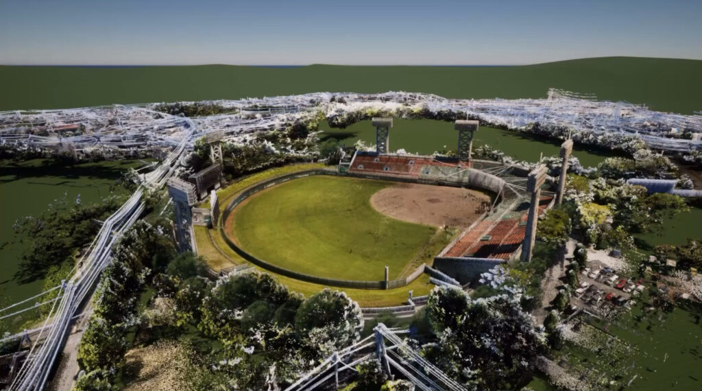 照明設計は、3次元計測によって周辺を含む点群データを取得し、球場の現況3次元モデルを作成することから始まった。ある国内大型スタジアムの照明改修を手掛けた際には、実測した結果と竣工図の位置が最大3mほどずれていたこともあった。特に高さ40mにも及ぶ照明塔の明確な位置を割り出す際には地上からの計測では難しい。「まずは現況の明確な把握が重要になり、点群計測と統合モデル化の信頼できるパートナーに依頼した」と明かす。