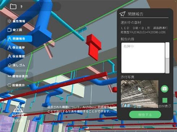ARアプリケーションはBIMとデータ連携することで、現場でデバイスをかざすだけで、壁や天井の裏にある設備機器や配管を可視化し、点検対象を瞬時に特定できる。BIMが持つ建物情報や設備仕様書なども取得でき、保全履歴情報などの取得や不具合があった場合にはその場でFM管理ツール側に報告することができ、迅速な対応が実現する。