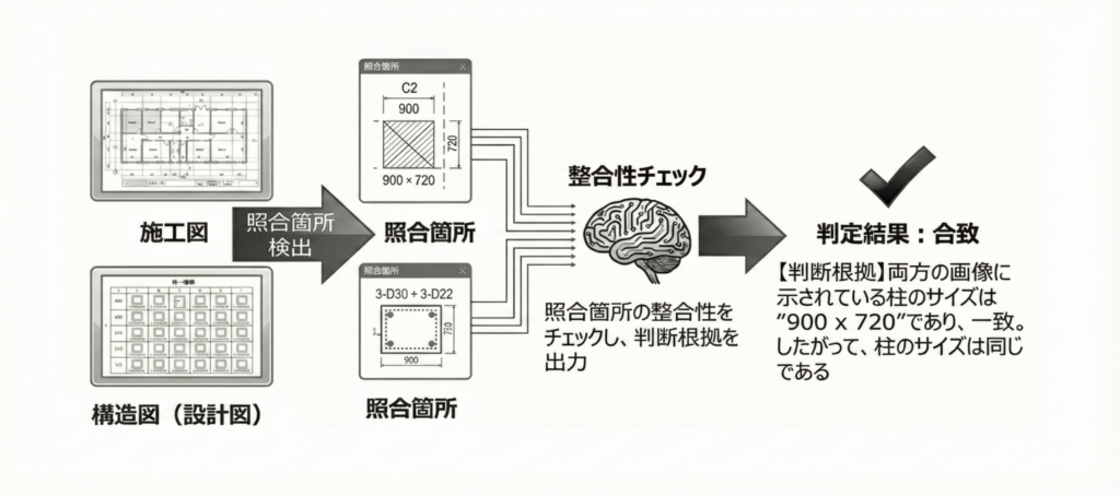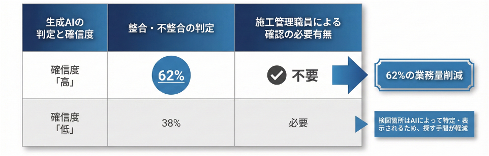 施工管理の職員は、協力会社が構造図(設計図)を元に作成した施工図が、元の構造図と整合しているかをチェックしている。施工図と構造図の整合性を把握した検証では、生成AIが高い確信度をもって整合・不整合を判定した領域が62%あり、この領域については施工管理職員による整合・不整合の確認が不要となり、大きな作業削減効果を把握した。
