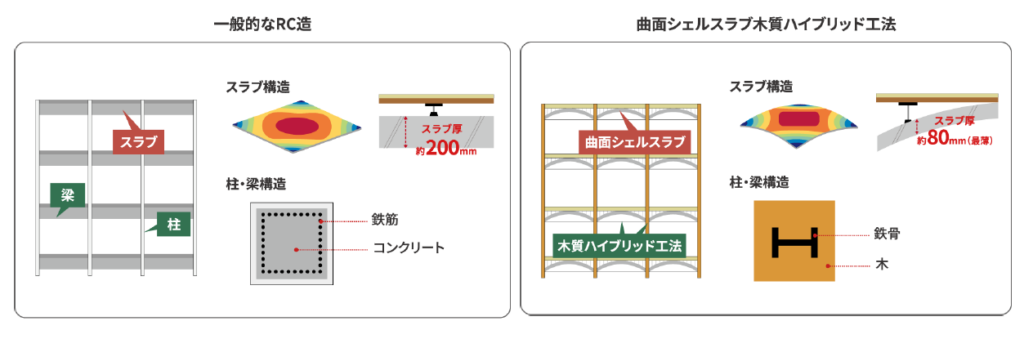 一般的な集合住宅の床スラブは、200mm程度の厚さが必要とされているが、曲面シェルスラブ木質ハイブリッド工法では、床スラブを曲面形状とすることで、荷重を効率よく分散することができ、スラブ厚を最薄約80mm程度まで抑えることができる。建築時に使用するコンクリート量の削減も可能になり、スラブ形成時の型枠を内装仕上げ材としても活用することで、内装の木質化によるCO2削減にも寄与するという。このほか電炉で生成した鉄を使用した鉄骨に木を被覆することで、建物の高層化に伴う、耐火性能要件へ適合しつつ、木材の積極的な利用し、CO2排出量の削減を可能にする。