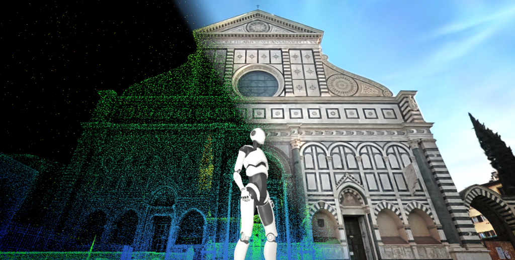 同社の計測サービスは、2つの技術を統合して提供している。1つはハンディ型/バックパック型LiDAR「XGRIDS L2Pro」などを用いたSLAM技術により、歩行しながら広範囲の3次元点群データを取得でき、従来の地上型スキャンと比較して数倍~十数倍のスピードで計測を完了させ、BIM/CIMモデル作成に耐えうる高精度なデータを生成する。