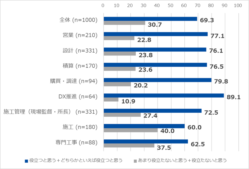 野原グループのBuildApp総合研究所が全国の建設産業従事者1000人を対象に、超高齢化社会による労働不足を懸念する2025年問題を題材に調査したところ、BIMやデジタルツールが「技術継承に役立つ」と考える層が全体の約7割に達し、教育時間不足やマニュアル化の遅れを課題視し、動画やICTで効率化を図ろうとしていることが浮き彫りになった。一方で「役立たない」と考える約3割の層は、技術は職人の腕という認識が強く、デジタルでは身につかないと考える傾向がある。