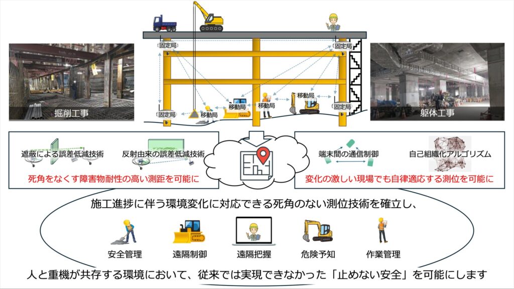 この技術は、人と重機が共存する動的な環境下では「隔離」と「停止」を原則とする従来の安全対策(Safety 1.0)では実現できなかった「止めない安全」を可能にするという。建設業界が直面する課題である重篤な労働災害の発生率を抜本的に改善し、国土交通省が掲げるi-Construction 2.0の目標達成にも寄与する。狭隘で見通しの悪い地下掘削現場をターゲットに、人や機械の位置関係をリアルタイムに把握し、作業員や重機オペレータに自動で危険を通知する仕組みを構築し、状況に応じて柔軟かつ安全に作業を行える「協調安全(Safety 2.0)」の実現を目指す。