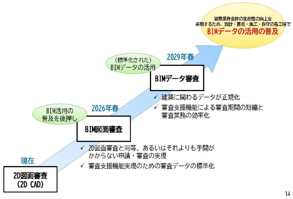 国交省は4月からBIM図面審査、29年春からはBIMデータ審査に乗り出し、確認申請のBIMデータ活用レベルを段階的に引き上げる青写真を描く。初弾となるBIM図面審査では、BIMデータから出力したPDF形式の設計図書に加え、補足情報として建築物を3次元で表示できるIFCデータの提出を求め、CDE(共通データ環境)上で各種データを審査していく。