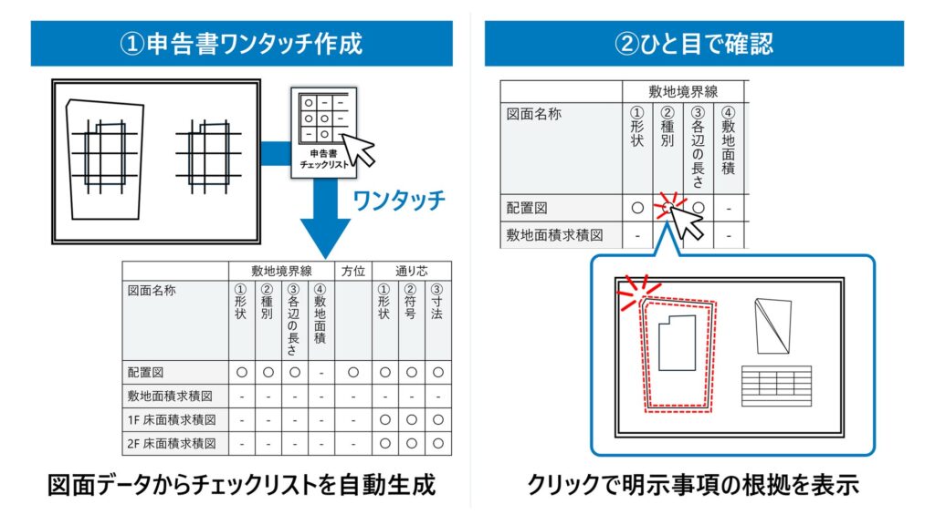 申請者の中には図面審査対応のために確認作業が増えそうとの声が少なくない。手動による申告者作成には4時間ほどの時間が必要となる。同社は一連の作業をワンタッチで完了することで、大幅な時間短縮を実現することで、これからも創造的な設計作業に集中できる環境を提供していくという。