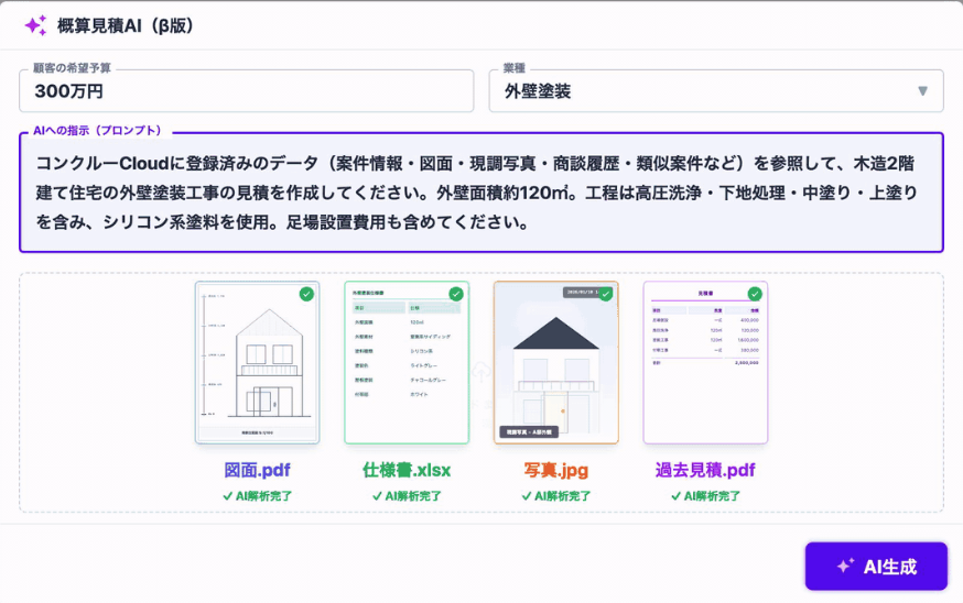 概算見積AIエージェントは、顧客の希望予算や、顧客要望、工事種別などをテキストで入力し、図面・仕様書・現場写真などの資料をアップロードするだけで、AIが概算見積を自動生成する。現場情報や各種ファイル、過去の見積、受注実績、単価情報などコンクルーCloud内に蓄積されたデータを横断的に参照・活用することで、精度の高い概算見積の生成を実現する。