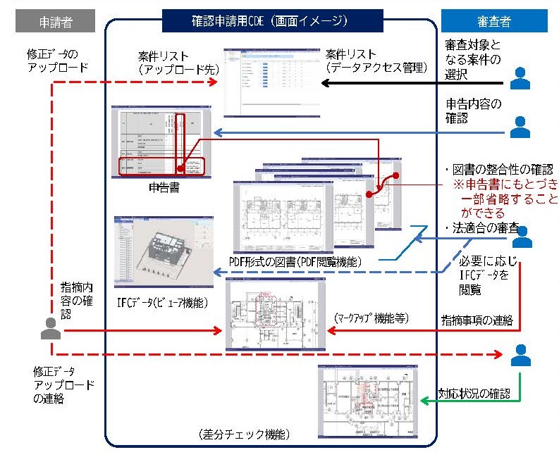 BIM図面審査では、指定確認検査機関がCDE上に専用サイトを開設し、そこに対象プロジェクトのフォルダーを作成し、消防や適合性判定機関を招待する。各機関が同じデータを参照し同時並行で審査が進むため、審査効率だけでなく透明性も向上する。ただ、指定確認検査機関は料金を支払って、アークシンクを利用するため、そのコストを料金に反映すべきか否かが課題としてある。