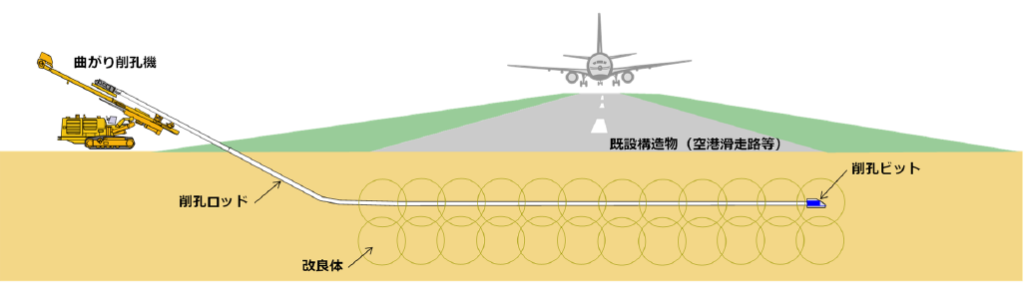 曲がり削孔は、地盤内を曲線状に削孔できるため、空港の滑走路や主要建築物といった既設の重要構造物直下の液状化対策に効率的だが、設計ラインに沿って削孔するには高い技能が必要となり、経験豊富な熟練オペレータでなければ計画どおりに施工できない課題があった。
