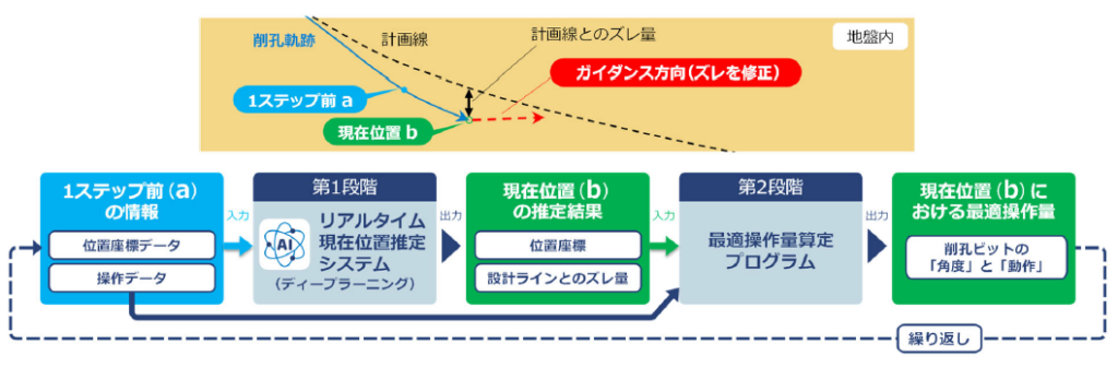 曲がり削孔AIガイダンスシステムは2段階の解析プログラムで構成され、第1段階のリアルタイム現在位置推定プログラムはAI技術のディープラーニングを活用し、1ステップ前の位置データとオペレータの操作データから現在の削孔位置をリアルタイムに推定する。これまでに蓄積した2,000m以上の削孔データを学習し、高い推定精度を実現した。