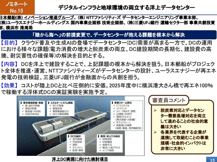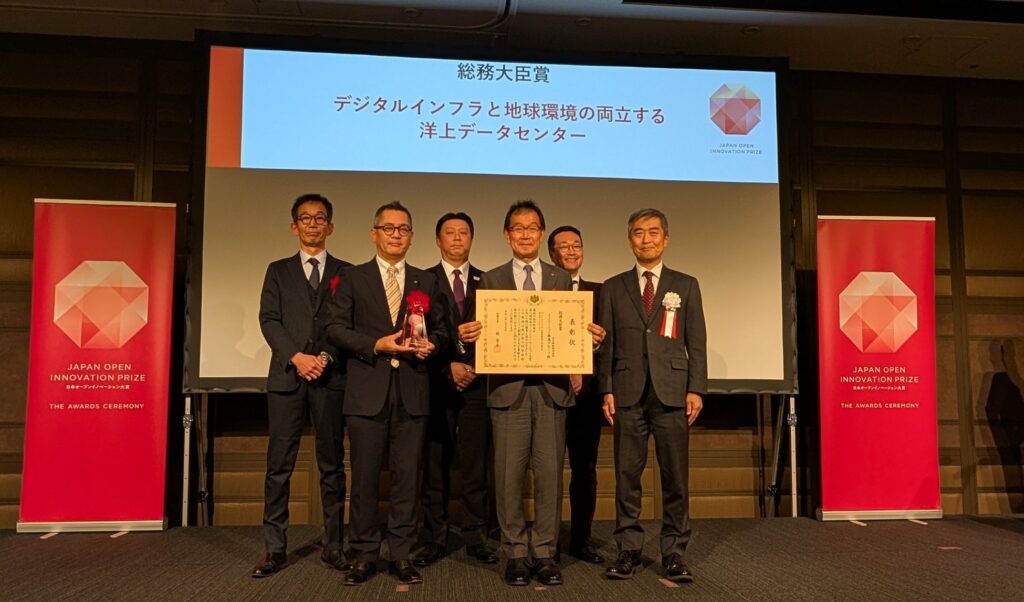 ユーラスエナジーホールディングス、日本郵船、NTTファシリティーズ、三菱UFJ銀行、横浜市が共同で検討しているデジタルインフラの成長と地球環境の保全を両立する洋上浮体型データセンターが、日本オープンイノベーション大賞総務大臣賞を受賞した。