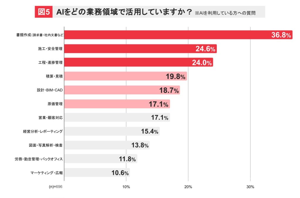 AIを導入する際に重要視する要素は、「現場と事務の両方で使える汎用性」が27.9%と多く、次に「図面・画像・帳票など建設特有データへの対応力」が24.3%、「既存システムとの連携性」が19.4%と続く。また、「書類作成」というイメージのしやすいAI活用が36.8%と高く、「施工・安全管理」や「工程・進捗管理」も24%台となり、建設特有の領域での活用が進んでいる。積算や設計、原価管理の領域でも約2割となっており、現場からバックオフィスまで様々な領域でAI活用が始まっている。
