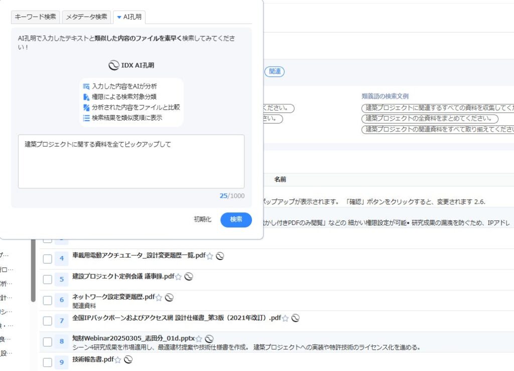 AI IPGeniusは、大型工事を多数手がけるゼネコンの工事統括・技術部門を想定し、過去プロジェクトで蓄積された会議議事録や設計変更に関する協議記録から、課題や判断理由を横断的に整理できる。日々のプロジェクト運営の中で記録されてきた検討内容を、次の施工計画や設計検討に活かすことでPDF、Word、PowerPoint、スキャン資料などの非構造データを対象に、内容理解ベースで検索・要約・解析を行う知の資産化ナレッジベースとなる。