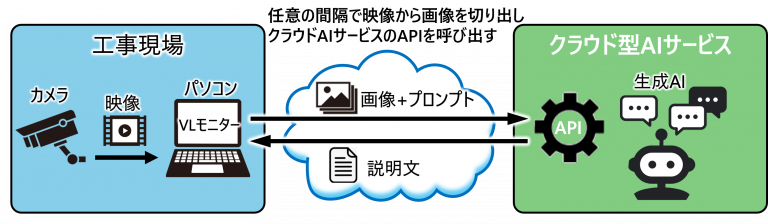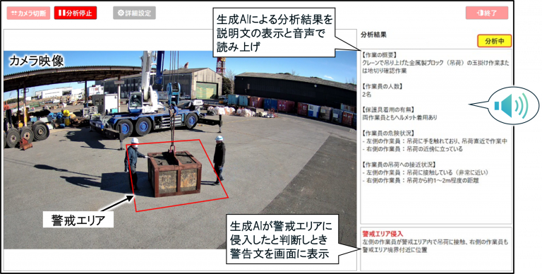 システムに活用した生成AI技術は、画像と言語情報を統合的に理解・処理できる視覚言語モデル(VLM)となり、現場のパソコンから市販のクラウド型AIサービスとAPIで連携し、カメラ映像を分析する。カメラ映像から任意の間隔で画像を切り出し、API経由で生成AIに送信することで、生成AIが画像内容とプロンプトをもとに現場状況を分析し、結果を説明文と音声で通知する。パソコン画面の映像上で警戒エリアを設定でき、プロンプトで指定した人物や物体などの監視対象物がエリアに入った際に警告文も通知する。