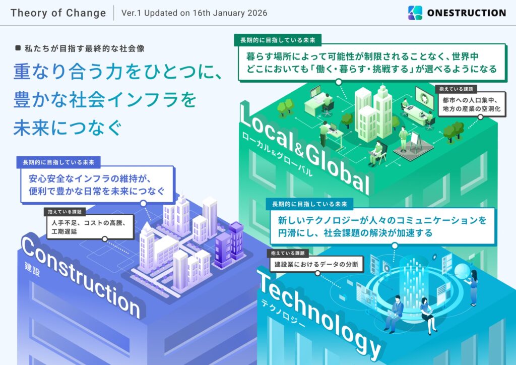 openBIMを基軸とした建設DXコンサルとして存在感を増しているONESTRUCTIONの目線は、どこに向けられているか。同社が社会インパクトの測定や可視化に向けた第一歩として、実施方針を明確化した「セオリー・オブ・チェンジ(ToC)」を策定した。近年、スタートアップや社会課題解決を目指す企業などで広がるToC活用の動きだが、建設系では同社が先陣を切った格好。公開したToCには、同社の目指す社会像やもたらしたいインパクトが可視化され、対話や協業の起点となる共通言語としての考え方がわかりやすく示されている。