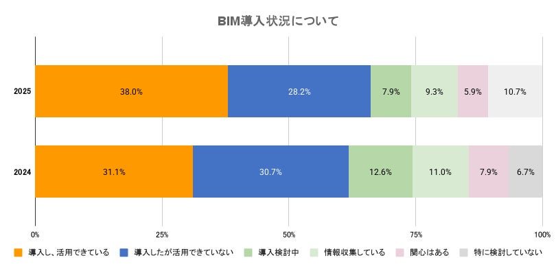 「導入し活用できている」とした企業の割合は1年前の調査から6.9ポイント増の38.0%となった。BIM導入企業のうち「期待した効果が出ている」という回答は22.8%から34.8%へと大幅に増加した。導入企業の37.4%が期待通りの、またはそれ以上の効果を実感しており、BIM活用が着実に成果を生み出し始めている様子がうかがえる。