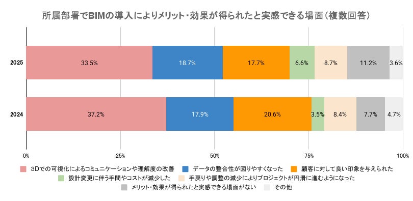 効果が得られたと実感できる場面では、「3Dでの可視化」が33.5%、「データの整合性が図りやすくなった」が1年前から0.8ポイント増の18.7%に増加した。同社はBIMが設計・施工プロセスにおけるデータの統一と活用に貢献し始めていることが伺えると分析している。