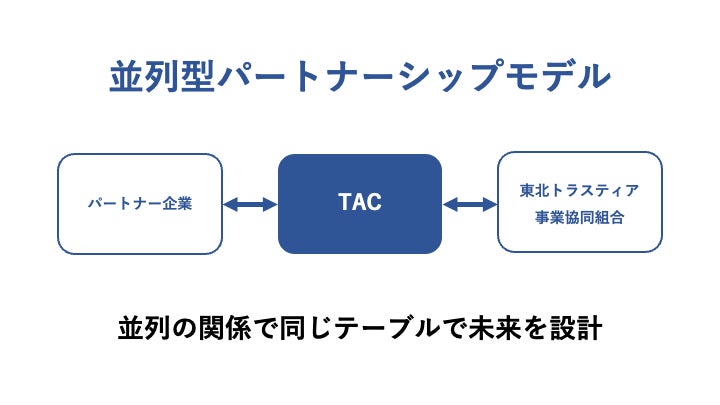 TACとパートナー企業6社、、設立予定の東北トラスティア事業協同組合は、いずれも独立した主体として、上下関係や従属関係に依らない「並列型パートナーシップモデル」を構築するという。元請、協力会社群、異業種企業という三者それぞれの視点を融合することで、建設現場の変革と事業構造の高度化を同時に推進する。