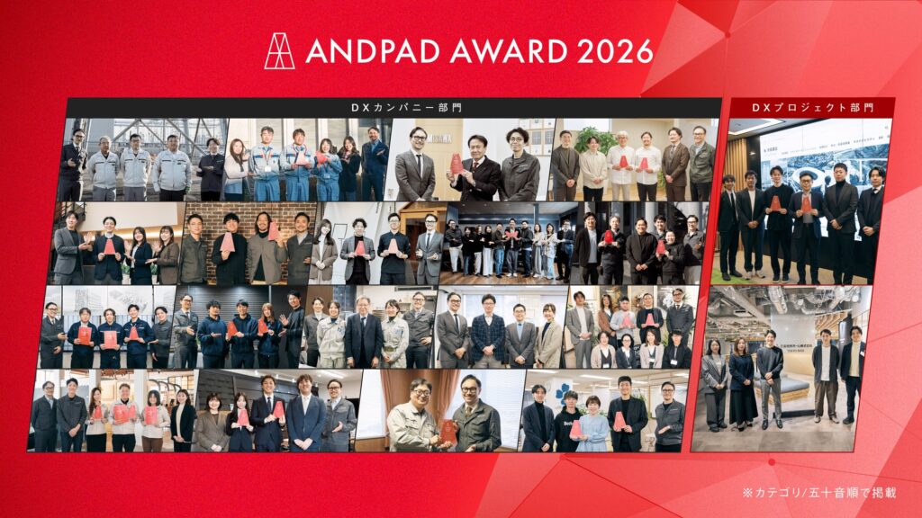 アンドパッドは、クラウド型建設プロジェクト管理サービス「ANDPAD」を活用してDXを実現する先進的な企業やパワーユーザーを表彰する「ANDPAD AWARD 2026」の入賞企業を発表した。DXカンパニー部門は18社、DXプロジェクト部門は2社となり、入賞企業の中から6月12日に大賞、最優秀賞、ONE賞を発表する。