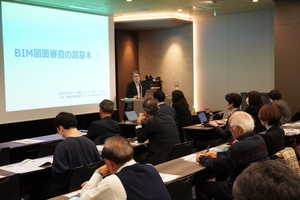 同日の全国ロードショー東京も、BIM確認申請をテーマに置いた。BIM図面審査の受け皿となる確認申請CDE(共通データ環境)サービス『ArchSync(アークシンク)』を運用する建築行政情報センター(ICBA)のBIM推進室から荒川暁郎参事が「BIM図面審査の超基本」をテーマに登壇したほか、MITO architecture+designの三戸景氏が「BIM図面審査はArchicadで即対応」をテーマに入出力基準をクリアする最適化したプロジェクトモデルデータの作成方法などを解説した。