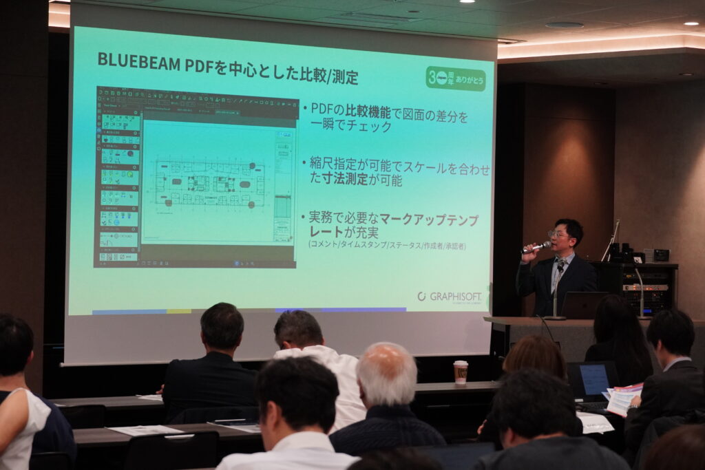 同社が注力するのは、BIMを軸に広がるワークフローの流れだ。ドイツに本社を置く建設・メディア系ソフトウェアカンパニーのNEMETSCHEK(ネメチェク)グループに属する同社では主力のArchicadに加え、BIMモデル自動検図システム『SOLIBRI』の販売を手がける中で、新たなラインアップとして建築図面専用PDF編集ソフト『Bluebeam(ブルービーム)』の提供もスタートした。「この3つのツールでより広範囲なニーズに対応できる。BIMを軸にモデルから出力した図面のチェックに加え、図面のやり取りやマークアップまでつながる一連のソリューションが実現する」と手応えを口にする。