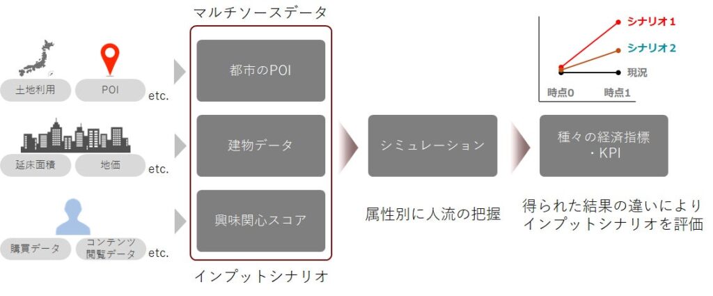 両社はGEOTRAの高度な人流シミュレーション技術と中央復建コンサルタンツの都市計画コンサルティング技術を融合し、来訪者の興味・関心や飲食店データを含む「マルチソースデータ」を統合した新たな都市評価モデルを開発する。