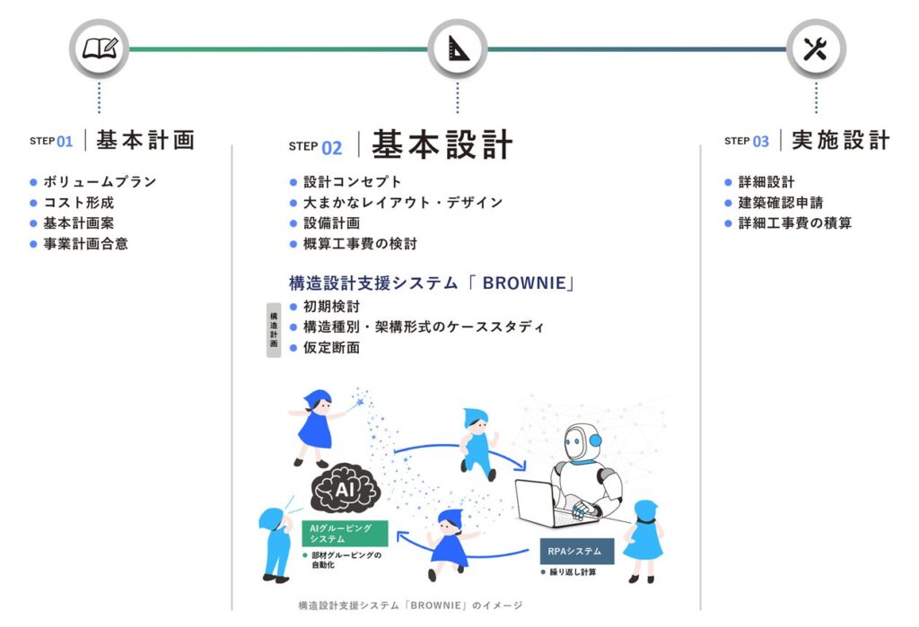 安藤ハザマはリバネス、ヒューマノーム研究所、ソーラーテックと共同開発したAIとRPA(Robotic Process Automation)を活用した構造設計支援システム「BROWNIE」を、構造設計部門の標準システムに位置付けた。経験によらず熟練の構造設計者と同等の成果を導くことができることから、構造設計の初期検討段階から導入し、既にシステムが適用可能な案件の90%で採用済み。基本設計の初期検討などの作業時間を平均約50%削減する効果を得ている。