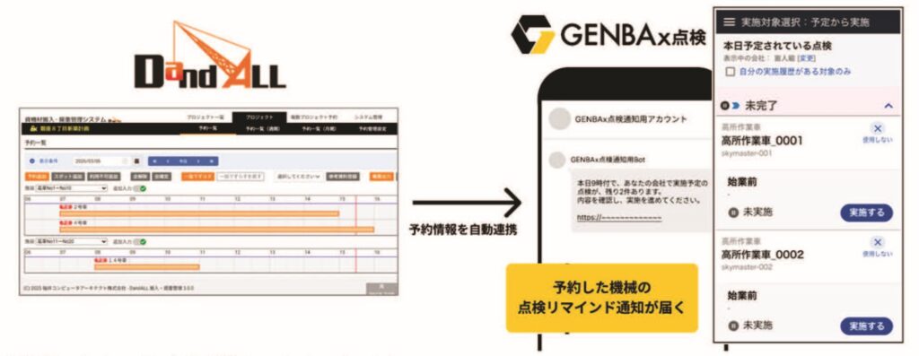 システム連携によって、DandALLの予約状況に基づき、適切なタイミングでGENBAx点検から通知が届くため、現場は点検の失念を確実に防止できる。最新の予約状況を反映する仕組みにより、急な予定変更が発生しやすい建設現場でも、常に適切なタイミングでの点検管理が可能になる。