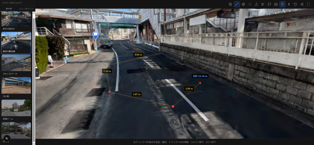 Machicaは、3DGSの活用で写真に近い質感を持つ3D空間を生成し、360度自由に視点を移動でき、現地に近い感覚で状況を把握することが可能。再現された3D空間上にBIM/CIMデータを重ねて表示することで、設計情報と現状を一体で確認でき、施工前後の比較や進捗確認を効率的に行う。専用アプリケーションのインストールを必要とせず、URLの共有のみで閲覧も可能だ。3D空間上にマーカーやコメントを付与できる機能も備え、関係者間のコミュニケーションを一元化する。