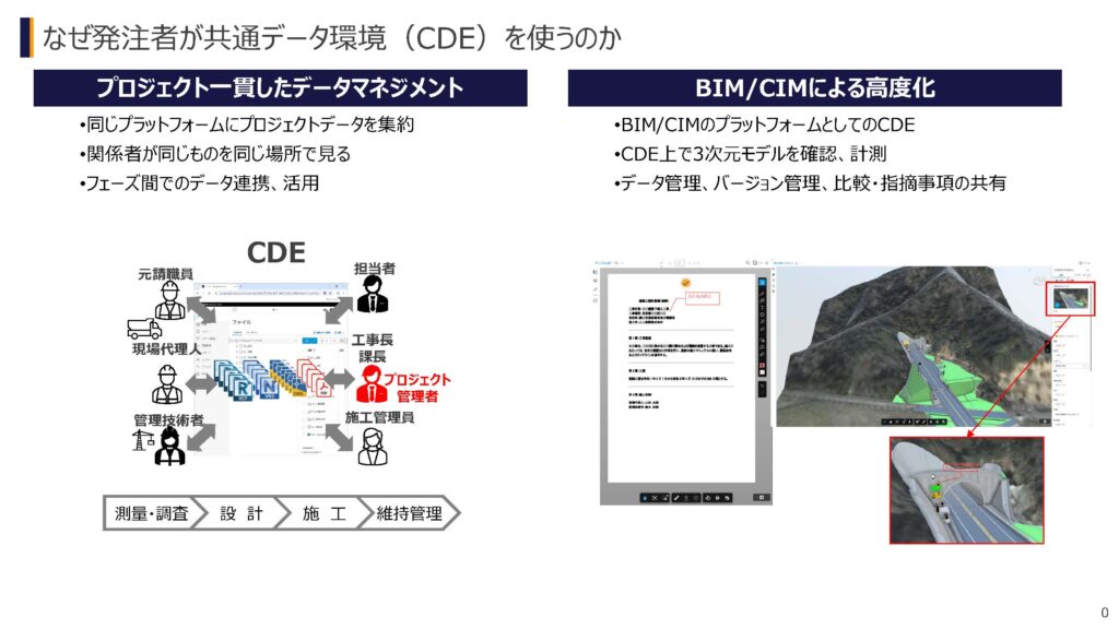 もう1つは測量・調査・設計・施工・維持管理という各フェーズ間のデータを授受する際、CDEを活用し受け渡したいと考えているためだ。それにより各工程をまたぐ際のデータ受け渡しの手間や労力を軽減できると考えている。CDE上にデータがあれば、われわれも容易に参照ができ、データ管理やバージョン管理の問題もクリアできる。