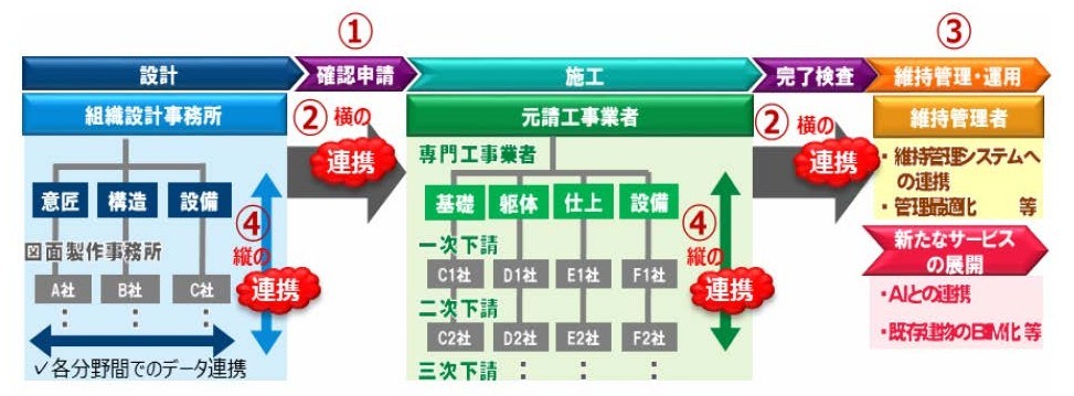 では、図の④が示す「縦」の軸は何を意味するか。これは、わが国の建設業が形成する重層構造とBIMの関係性をつなぐ流れになり、建築プロジェクト関係者のそれぞれがBIMデータとどう向き合うかということを指し示す。