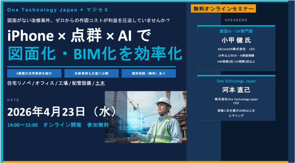 One Technology Japan(川崎市)は、4月23日に無料オンラインセミナー「図面がない改修案件、ゼロからの作図コストが利益を圧迫していませんか?〜iPhone×点群×AIで低コストに図面化・BIM対応を効率化〜」を配信する。