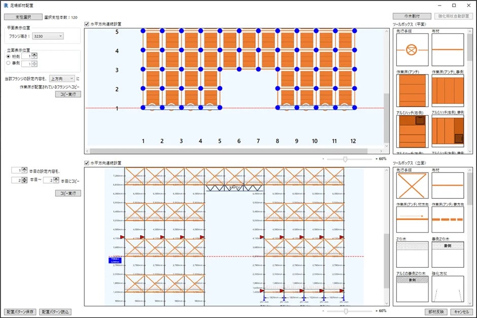 内部足場機能は年間100件を超える足場BIMを現場に提供している杉孝の膨大な知見をシステム化したもので、杉孝が提供する次世代足場「アルバトロス」に対応し、Revitの操作に不慣れな担当者でも直感的に安全なルールに基づいて足場の配置を可能にする。具体的に「支柱自動配置」「部材配置」「単管配置」「壁つなぎ配置」「ステージ自動配置」「足場自動配置」などの機能があり、さまざまなニーズに対応できる。