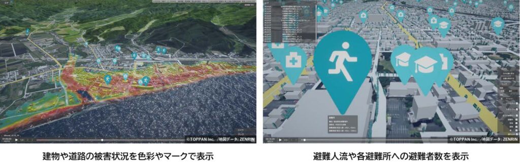 TOPPANは、ハザードマップなど自治体の持つ様々な災害データを都市のデジタルツインと組み合わせることで、地域の災害リスクをデジタル空間で仮想再現し、災害対策や訓練・防災教育などの自治体業務を支援するサービスを始めた。