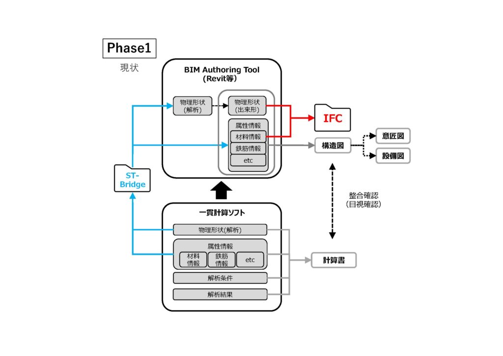 BIM図面審査に必要な構造図と構造計算書は、RevitをはじめとするBIMソフトと、一貫構造計算ソフトを使って作成することが想定される。双方は日本独自の建築構造標準フォーマット「ST-Bridge」形式でデータを連携しており、一貫構造計算ソフトから構造計算書、BIMソフトから構造図を出力しているが、BIM図面審査で参考提出が求められるIFCデータについては構造図に記載される内容が対象となることから、BIMソフトから出力する形で対応する流れになる。