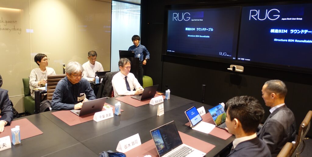 今年5月に東京・虎ノ門のオートデスク本社会議室で開かれた会合「構造BIMラウンドテーブル」には、BIMソフト『Revit』のユーザー会「RUG」の構造ワーキンググループと、Revitによる業務プロセスの効率化を目指す大手ゼネコン5社のBIM推進担当らで構成する組織「BIM Summit」の主要メンバーに、一貫構造計算ソフトベンダーの担当者らを加えた総勢20人が参加した。