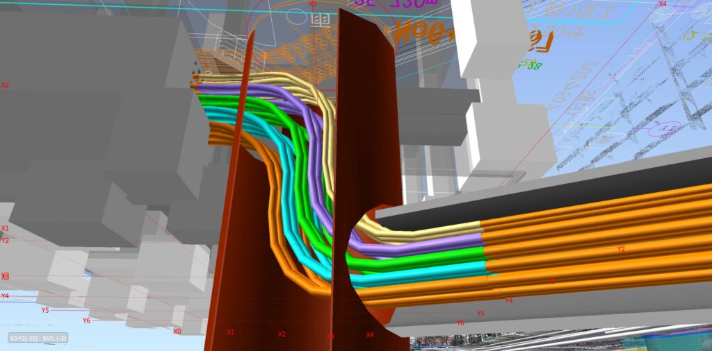 ルートは、電力施設から推進管内を通って電力供給網を構築する長さ約370mにも及ぶ。同社の業務はルート周辺の現況把握に加え、計画トンネルと既設物の干渉や回避、さらにはトンネル内の配管計画など多岐にわたる。既に長さ約120mの1期工事は完了し、現在は残り約250mの2期工事が進行中だ。「業務を進めながら、BIM/CIMツールを使いこなすスキルを身に付けてきた」と強調する。