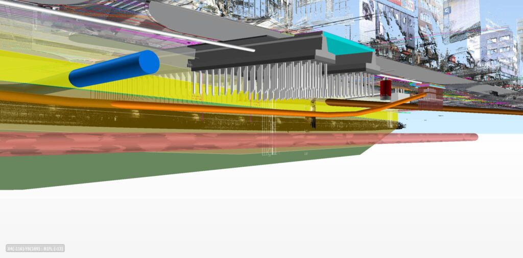 電力施設の接続部を起点に推進工より長さ約120m地点まで掘り進める第1期工事区間では平井氏がCivil 3D、坂本氏がRevit、そして蝶氏がモデル統合を担う明確な役割分担で業務に取り組んできた。現在進行中の長さ約250mの第2工事区間では、3人とも各ツールの操作を一通り習得したことから、あえて担当を決めず、それぞれのスケジュールに沿って作業を進める流れに変えた。