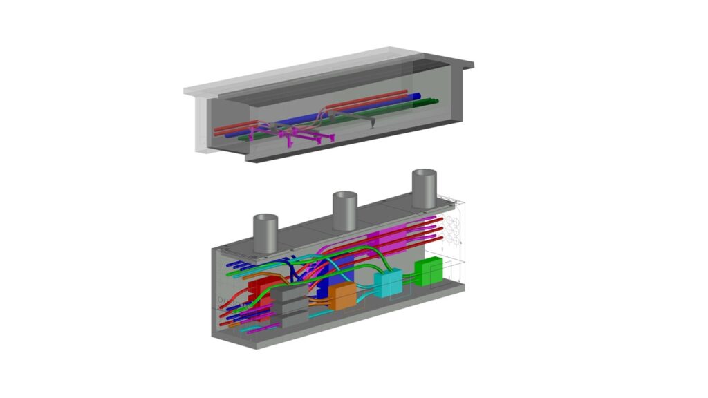 橋梁添架では管や電力ケーブルの取り合いを3次元で詳細に検証でき、小規模変電所では設置後の状況を見える化することで、関係各所や住民との協議に3次元が有効に機能する。「われわれ3人が市街地の調査・設計業務を通して実感したように、新たな3人にもBIM/CIMの有効性を体感してもらい、業務ツールとして効率的に使ってもらいたい」と考えている。